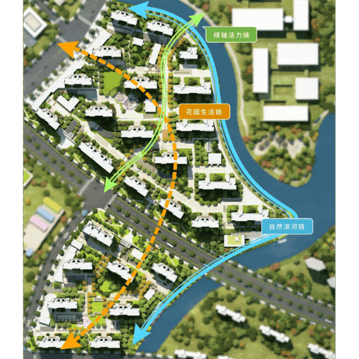 自然滨河链的设计包括了滨河花园区、滨水商业区、休闲慢跑区,从休闲到娱乐到活动,全部集齐!