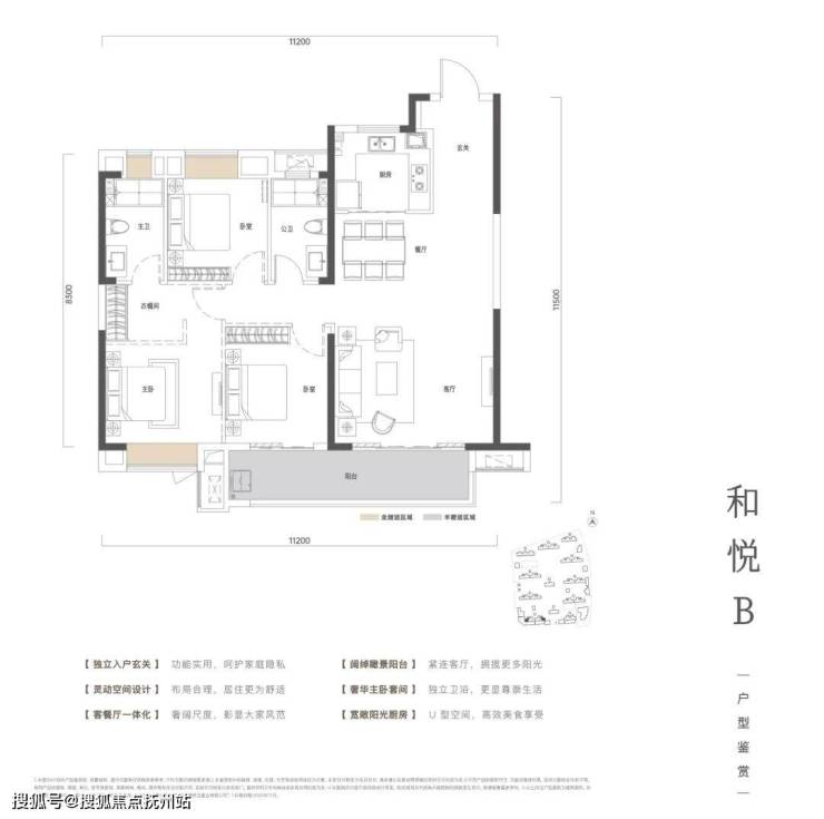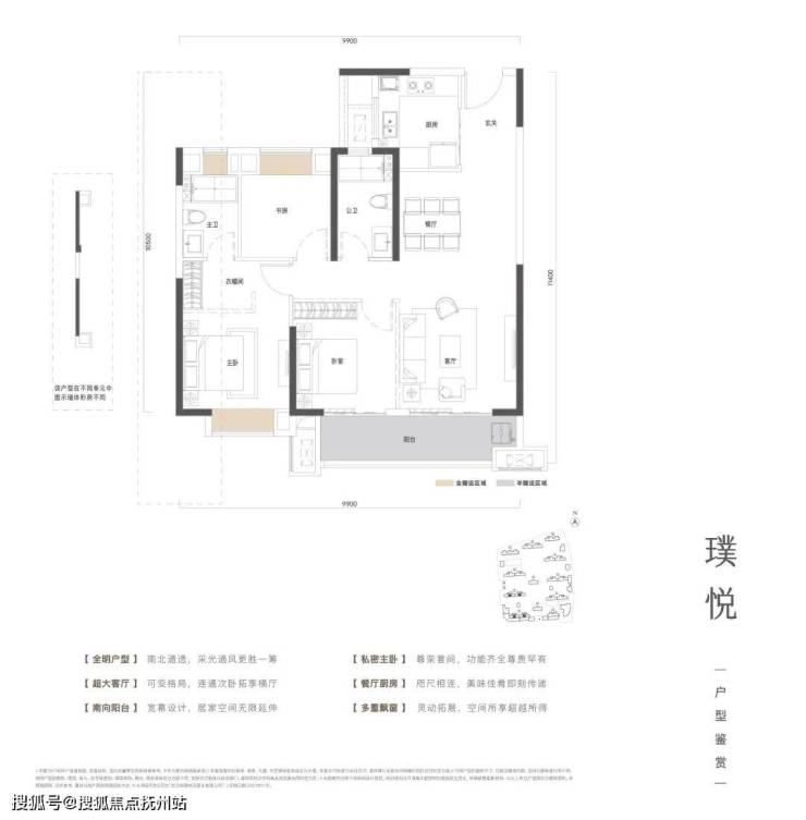 该户型客厅开间更大,活动区更开阔,甚至有了一点横厅的效果;主卧南北双飘窗,带独立卫生间,空间感与舒适度高。
