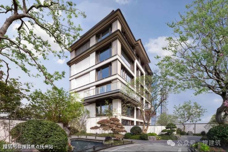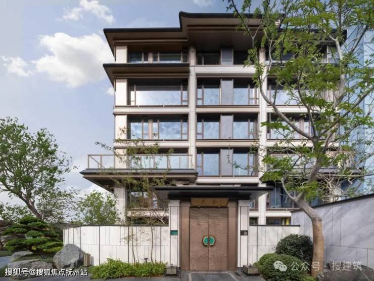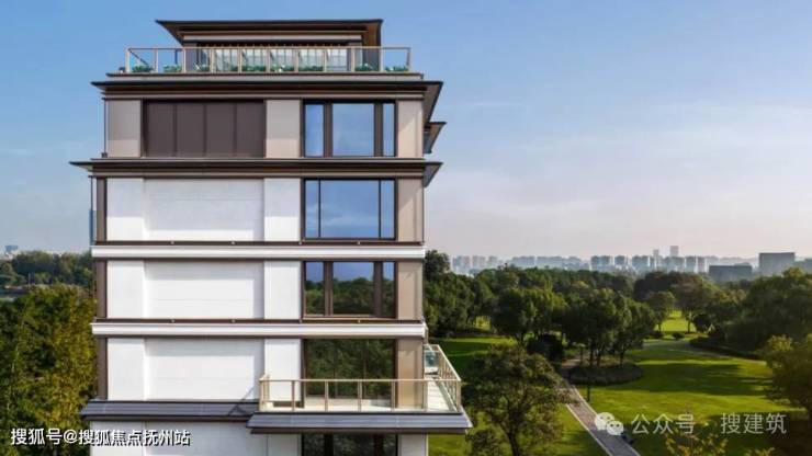 建发·璟园的立面设计,源自对宋式建筑体系的深度溯源。项目团队借鉴北宋壁画中的楼阁形象、兼取苏州现存建筑及园林中的楼阁元素,加以提取简化与演绎,形成“三阁并联”的立面语言。