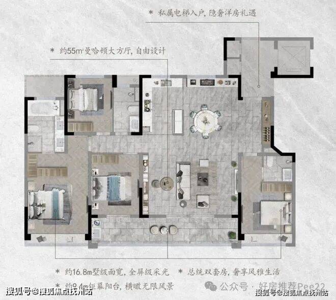 建面约179㎡约55㎡的曼哈顿大方厅,充分利用了过道的面积,把客厅的延展面做到。兼得“方正感”与“大尺度”,将客厅完全解放,任由你自由创作。
