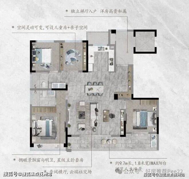 约9.7m长,1.8米宽IMAX阳台,加上约45㎡的大方厅,如此嘉兴市场开创性的设计,在保证采光及观景面更充足的前提下,让空气的对流也更加流畅,更大程度上提升了全屋的通透感。