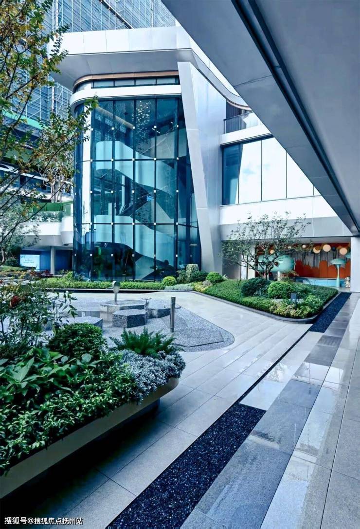 建筑体量延伸至室外下沉庭院,后场在前场及建筑造型的基础上加以演变,运用折弧线等流线性,营造出丰富且动态的后场景观。