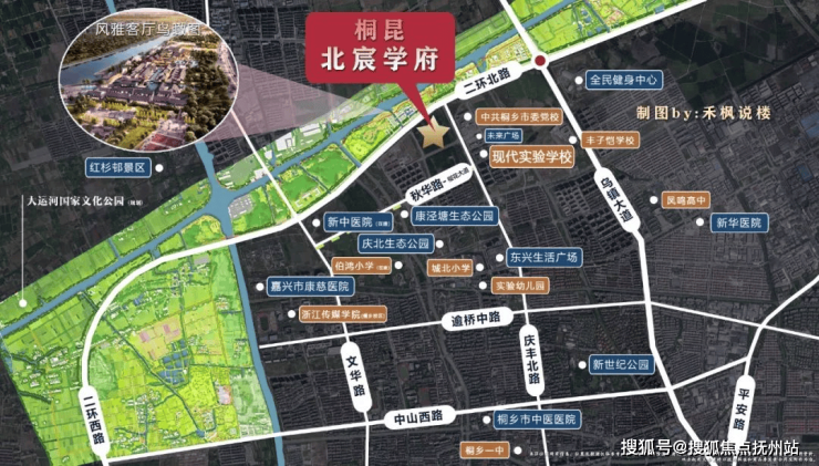 北宸学府地处庆丰北路中轴之上,背靠 大运河国家文化公园(待建),向北是桐乡快速发展中的 乌镇大数据高新技术产业区,高新人才涌入而来。