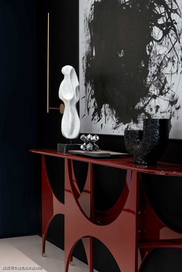 充满仪式感的前厅过廊原来是设备间和过道,设计师将其梳理成家庭生活的配套空间。换鞋区、宠物间和洗衣房等功能空间被安排于此。过道两侧的墙面用深色木作装饰,与白色的顶地形成强烈的对比,两条地面灯带亮起,引导你走向入户大门。打开大门,入眼是SEM的Butterfly边柜,红色的陶瓷漆面散发着活力和热情,纤细的形态又带着优雅与内敛。