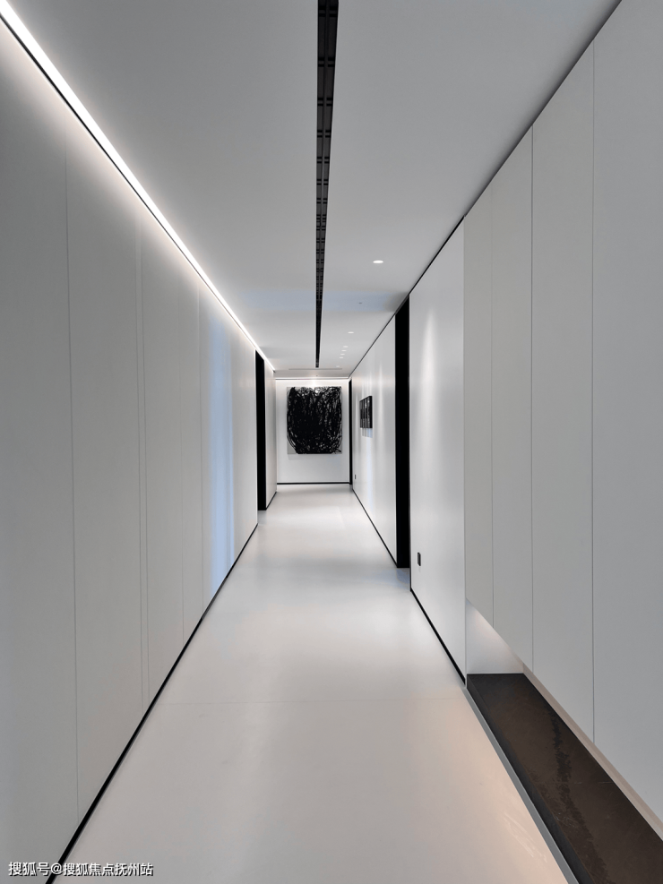 一条贯穿东西的长廊串联起生活的路径。向西是客餐厨的活动空间,向东则是一字排开的卧室。内部主廊道一侧使用木作和柜体拉平视线,增加收纳空间,另一侧则挑选艺术家的画作作为装饰,提升家的艺术氛围。