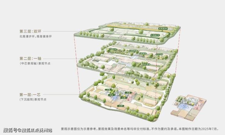 “立体景观芯”,下沉庭院复合型功能空间,非平面铺陈,目之所及皆是立体画境。