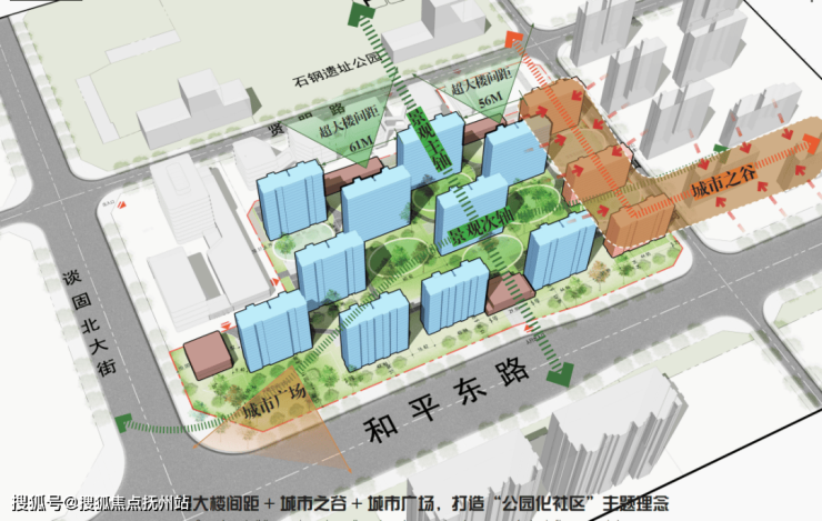 西侧布置小高层,采用近疏远密的规划布局,侧向间距控制在56至61米之间,与北侧商业及石钢遗址公园实现视线渗透与空间互联。地块四周点缀配套用房,西南角规划城市广场,结合道路及开敞空间合理布局,丰富了沿街界面形象。