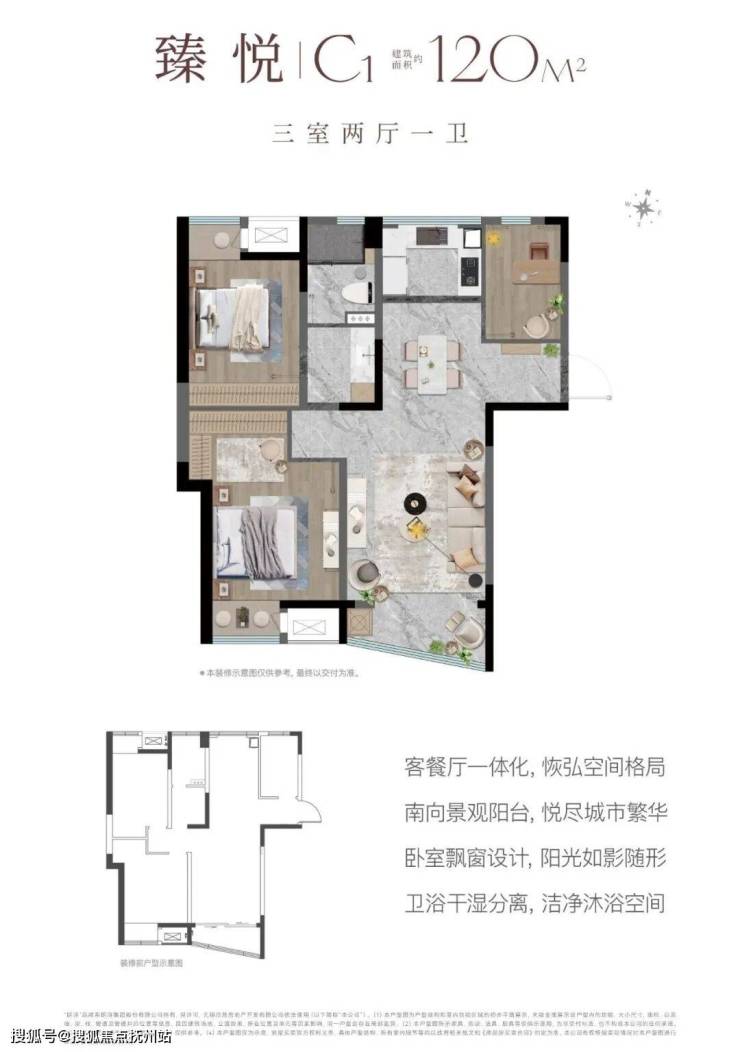 建面约120㎡ 3室2厅1卫:客餐厅一体化设计,连接南向景观阳台。主次卧室均匠心设计宽幅飘窗,将阳光引入室内。卫浴空间干湿分离设计,有效提升使用效率与安全舒适度。