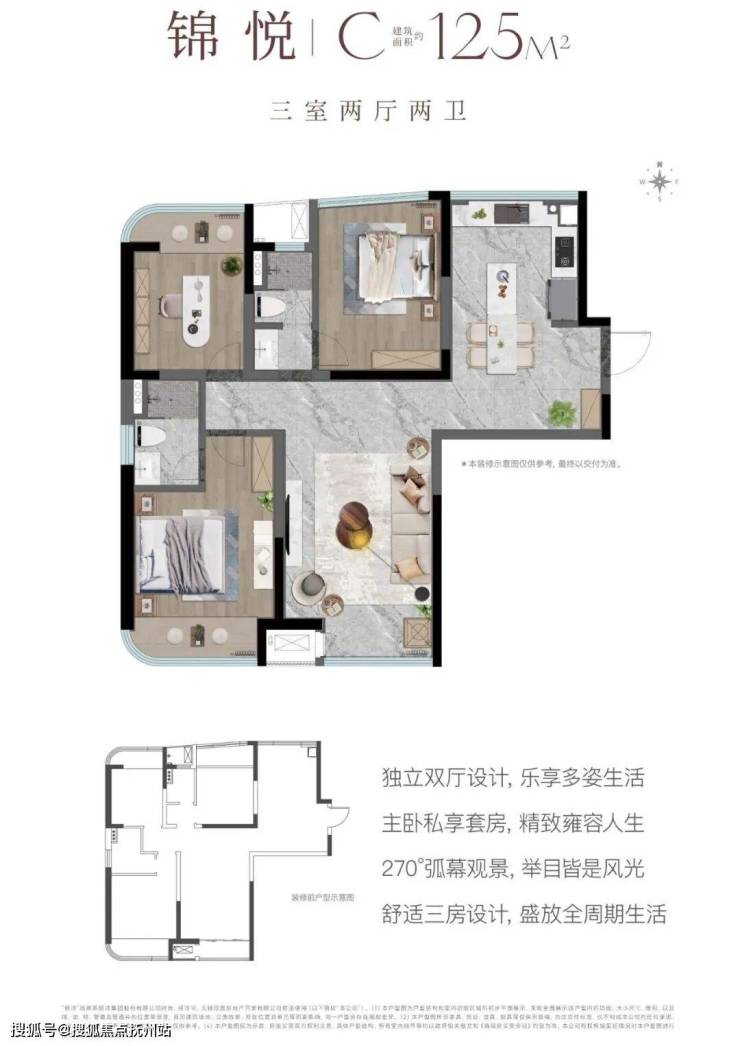 建面约125㎡ 3室2厅2卫:舒适三房格局,创新采用独立双厅设计,空间功能明确,动静分区清晰。主卧尊享套房,构筑专属的静谧领地。270°弧形观景面,将无遮挡的广角视野引入室内。