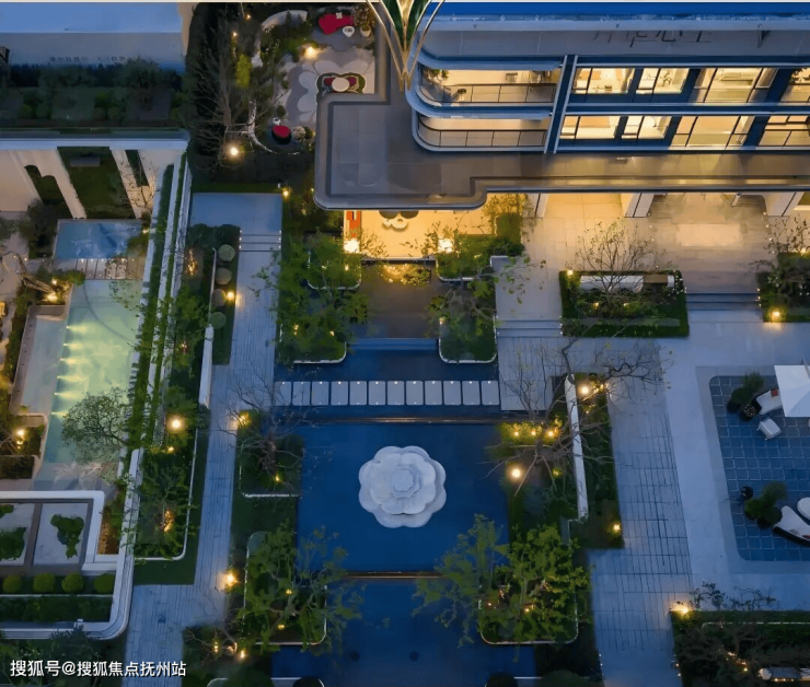 下沉式庭院巧妙借鉴自然山谷的形态,以叠水、绿阶、浮岛等元素精心构筑,呈现“飞瀑挂崖”的生动景致。庭院中央的女王画舫若隐若现于林水之间,业主可在此品茗赏景,尽享“都市女王”般的优雅与从容。