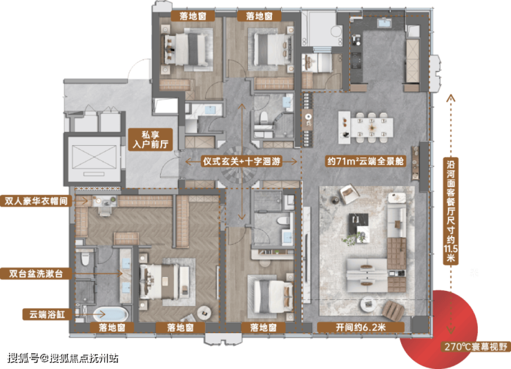 龙湖・山河颂建面约270㎡户型产品的突破,在于270°环幕观景设计——客厅与餐厅衔接的大面落地玻璃幕墙,形成约11.5米沿河面客餐厅观景尺度,将千年运河风光与半壁苏州的城市天际线完整纳入室内。
