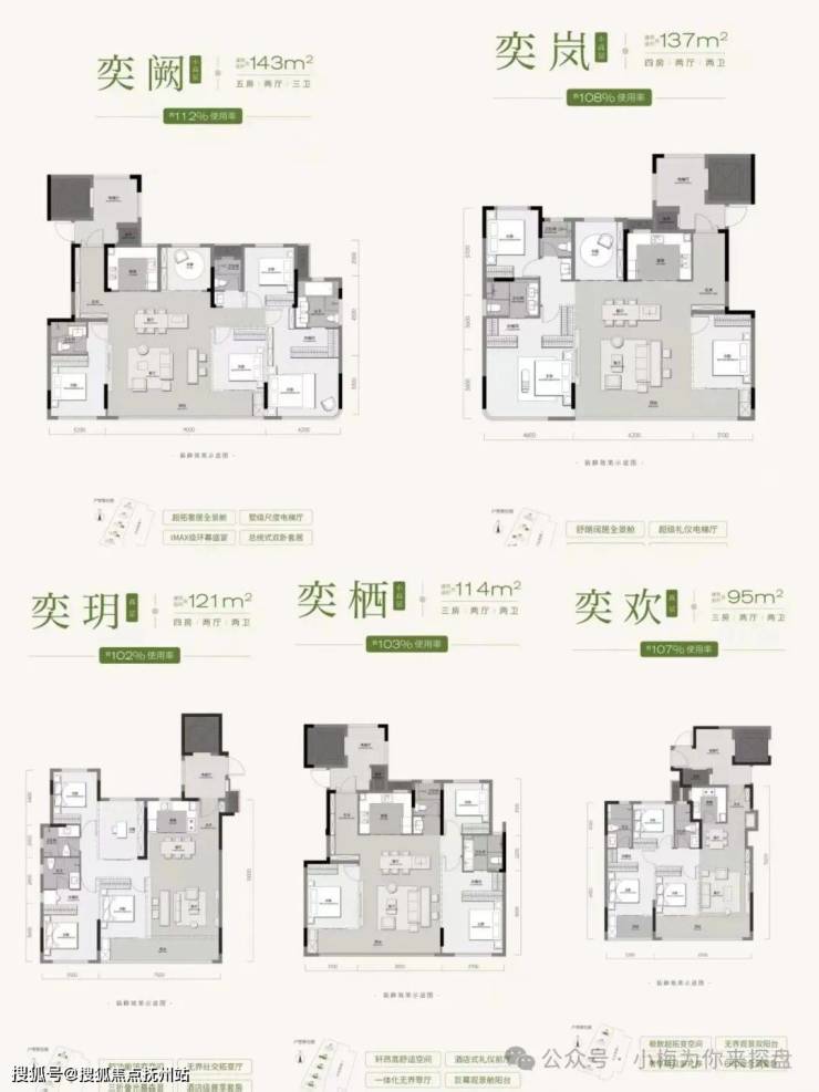 天创-云和奕项目分两期开发,其中一期:5栋11-26层住宅,335户,户均建面116平。一期1#1个单元26层,2、3、4#二个单元都是17层,5#二个单元11层 。都是第四代住宅设计,容积率低,最高得房率约112%,全2T2户配置专梯入户。95-143的面积段都有户型图如下