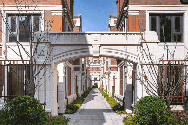 项目整体建筑布局南低北高,结合“厅、堂、园、苑”的空间景观布局及“街、巷、弄”三层道路体系,将老上海的里弄文化铺展开来。