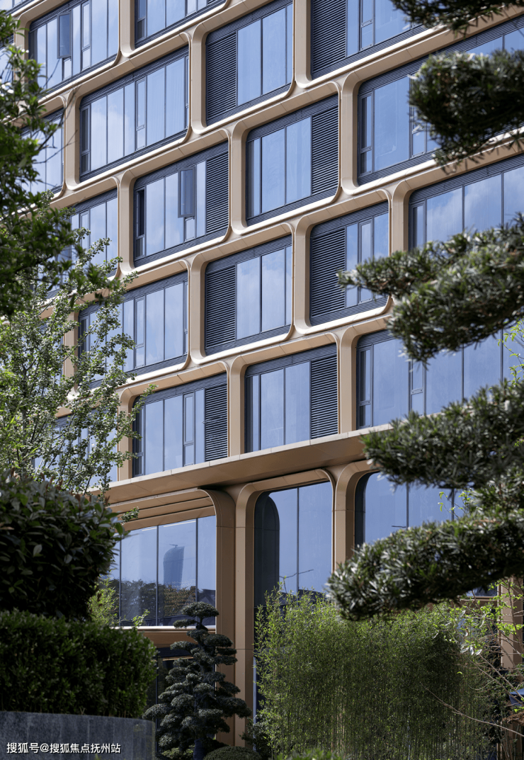以“潮涌”为意象,立面设计提取钱塘江水的流动节奏,抽象为层层律动的香槟金色曲面铝板与大面玻璃系统交织的建筑语言。