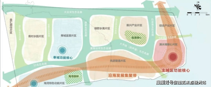 承接临港发展第一站:临港整体沿两港大道向西发展,中部为承接发展第一站
