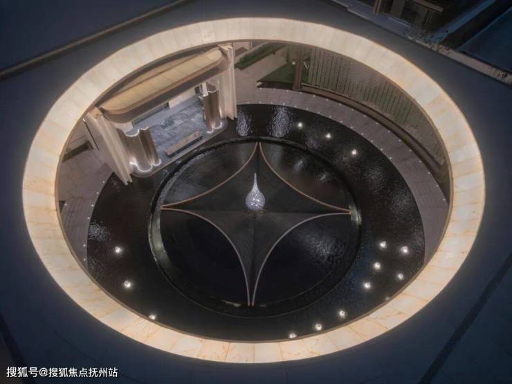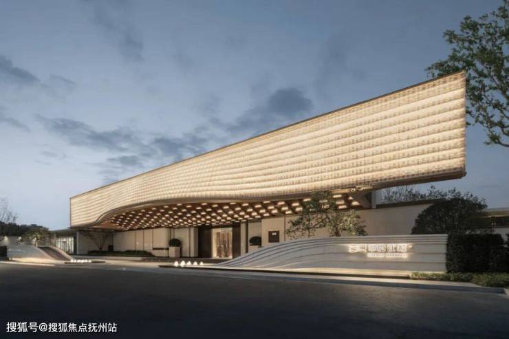 一礼「潮生望澜」,初见便显非凡气度。全长约46米的恢弘门头,凝固“钱塘潮起”的壮丽瞬间,以现代手法诠释内敛雄心。大门顶部利用大片玻璃互片来打造犹如一块巨大的水晶,贴合项目“和光粼粼”自的主题,据说是2000片波浪形水景玻璃瓦精心拼合而成。
