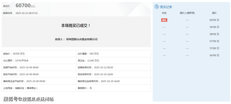 该项目即乌衣浜及周边地块,于2025年10月22日成交,楼面单价15643元/㎡,竞得单位为常州晋陵山水置业有限公司。