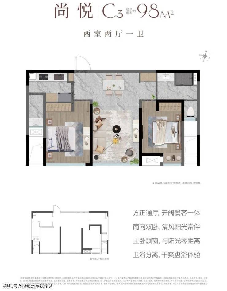 建面约98㎡ 2室2厅1卫:南向双卧,动静分区;方正通厅设计,揽阳光清风入室;主卧带飘窗,更多自由空间。