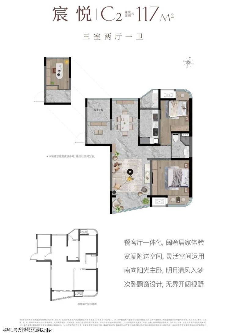 建面约117㎡ 3室2厅1卫:餐客厅一体化设计,规划有宽阔的附赠空间,可根据家庭成长阶段与个性需求自由定义。主卧朝南布局,次卧采用飘窗设计,将视野与光线最大化引入。