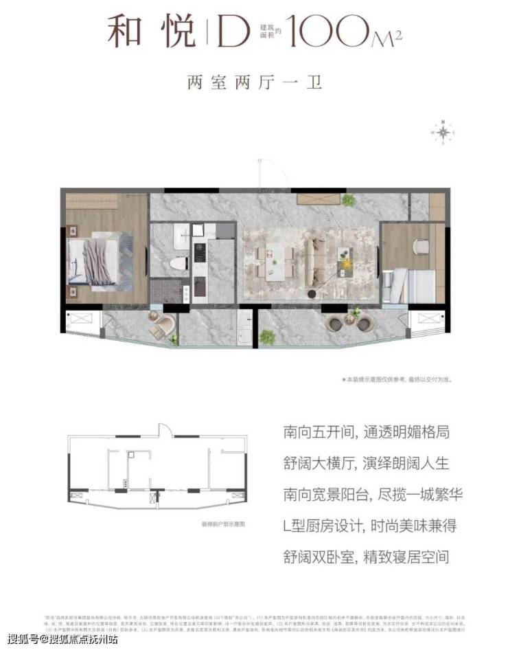 建面约100㎡ 2室2厅1卫:罕见南向五开间,引光纳景,格局豁然开朗;LDK一体化的大横厅设计,打破空间界限,南向连接大面宽景观阳台,形成开阔的公共活动区。