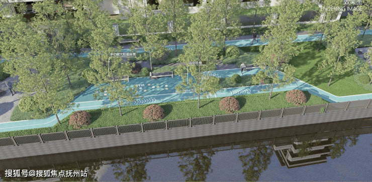 借景古塘河,营造约2600㎡的滨水生活公园,建有绿地草坪、约300米跑道、健身设施等。未来生活于此,晨光中沿河慢跑,微风里铺开野餐垫,树荫下与孩子嬉戏,落日时与家人漫步闲聊。