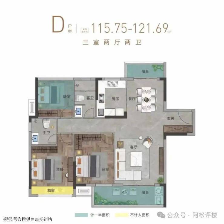 建面约115平和121平的边套户型结构类似,都是南北双阳台,通透性舒适度超强的大三房。