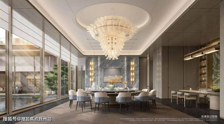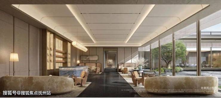还有下沉式飞瀑庭院设计:围绕着飞瀑景观,规划了下沉式会所,有恒温泳池、私宴厅、健身房、行政酒廊等;架空层泛会所有品茗区、儿童空间等。