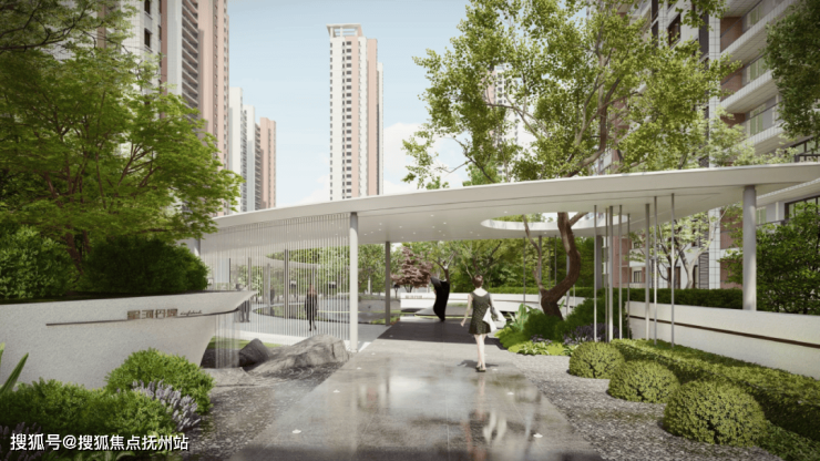 礼仪入口门楼、精致灯箱、花池景墙营造品质感;林荫树阵、艺术花池、对景小品、星光步道点缀巷道空间;提供不一样的归家体验,穿过林荫路,静享生活之乐,嘈杂环境外,是精致的植物对景空间。