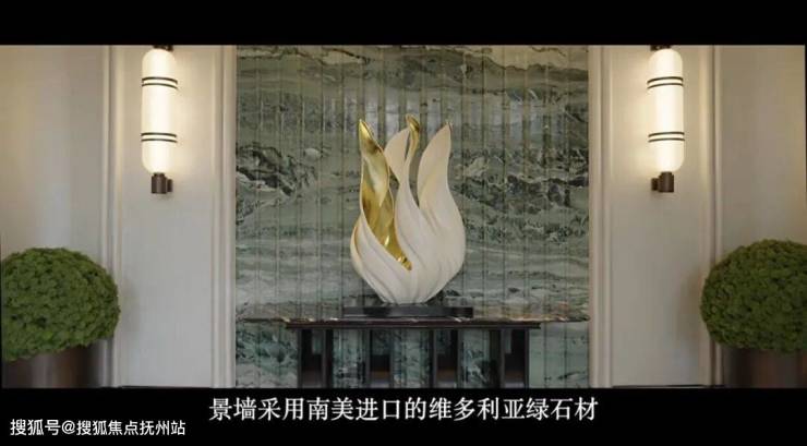 入口过厅,景墙采用南美进口的维多利亚绿石材,石皮板墙面纹理细腻,水刀拼花地面精致典雅。