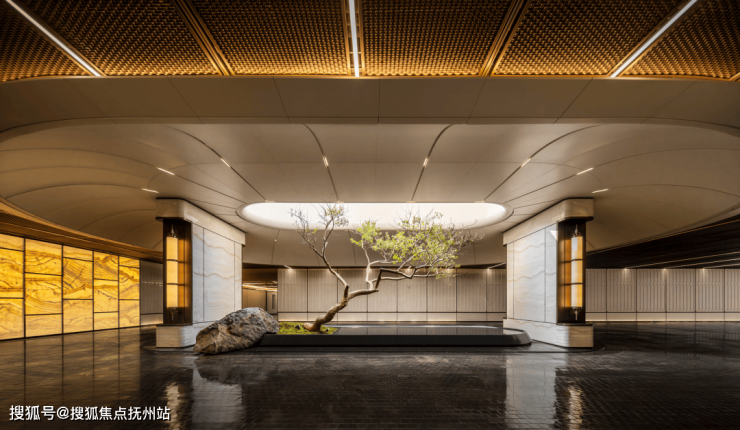 特设 “楠书院”户外空间,植有金丝楠木、文冠果,寓意文脉相承、基业长青。艺术装置 《沄熠之舟》 静立其间——聚财、耀门、致远,是为家的精神图腾。