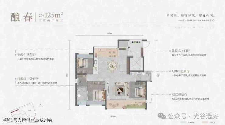 建面约125㎡的三房两厅两卫,是全封窗的准四代产品。