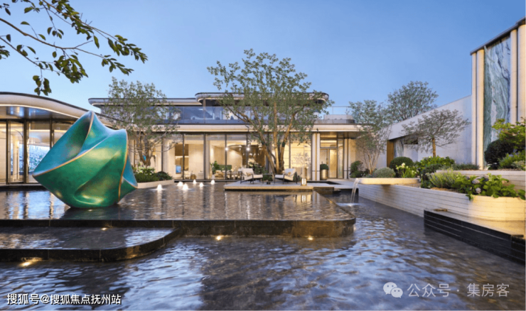 社区主入口是超宽幅门头,宽约 80m 高约 7.1m,两侧的维多利亚绿奢石以及中央的白雪公主透光石很吸睛,浅色的部分则是贝金米黄石材,圆弧的工艺处理也更显温润及价值感,中央栽植的超大紫薇树拥有约60年树龄,底部则是采用宝格丽黑奢石作为基座
