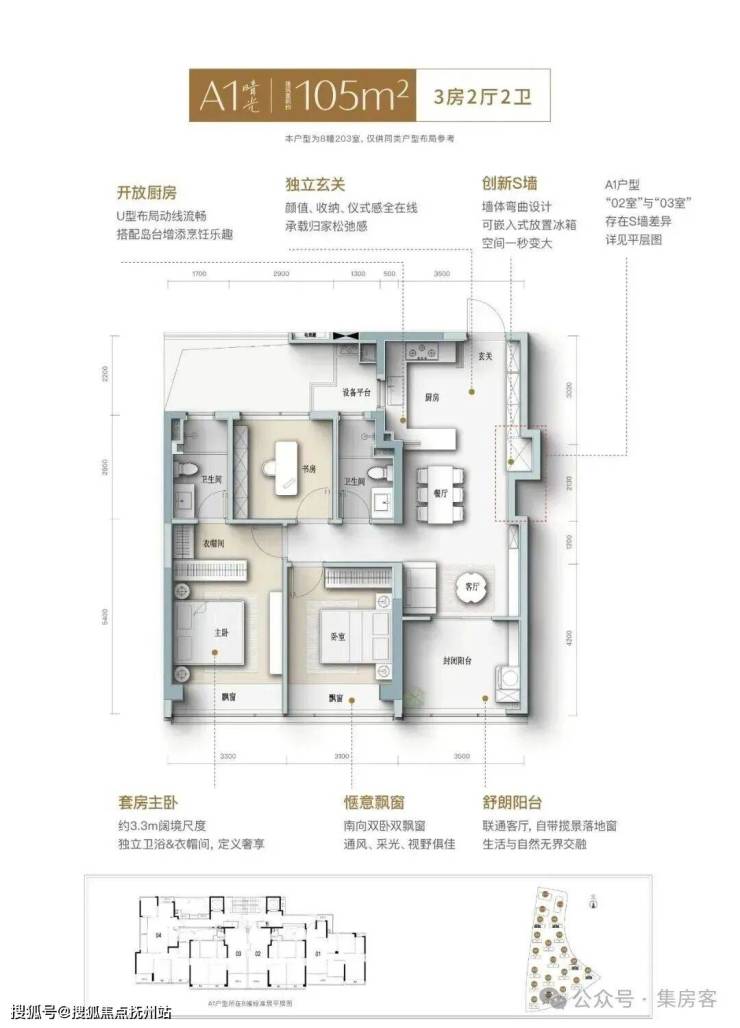 建面约105㎡晴光户型,不仅实现更优面积排布,更做到精神与审美的高度适配。在设计中,这间三房同样拥有南向大面宽,搭配S墙/开放式厨房/一体化餐客厅/多功能书房/酒店套房主卧等,将整个空间的开阔感和互动性做到极致,满足居住者对舒适、安逸的“精准需求”。