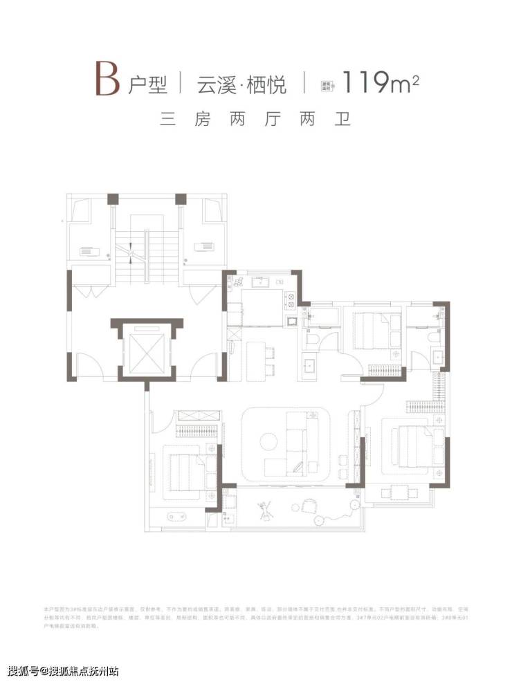119㎡三房:一梯两户对开门设计,私密性与归家仪式感兼备;约12.4米南向开间,搭配大面宽阳台,采光与视野出色。