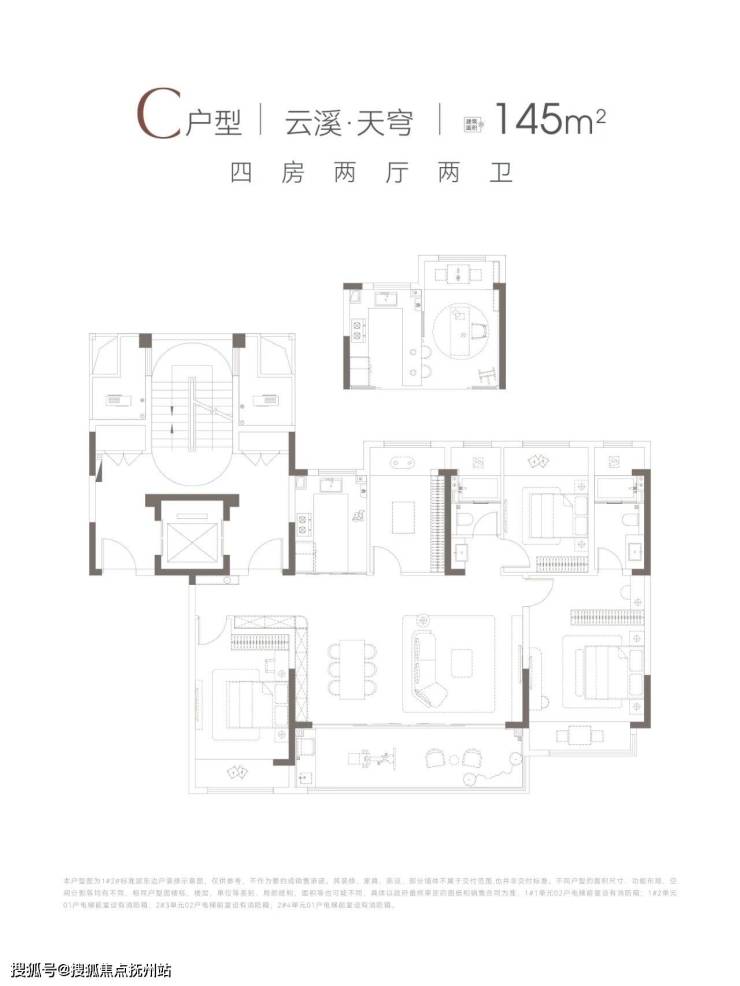145㎡四房:一梯一户独立电梯入户,奢阔阳台与客厅无缝连接,空间阔绰;主卧套房设计,配备独立卫浴与衣帽间。