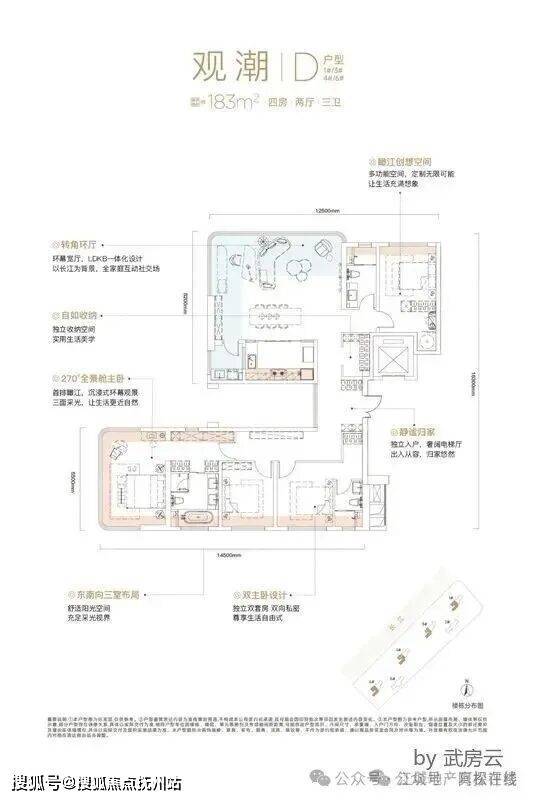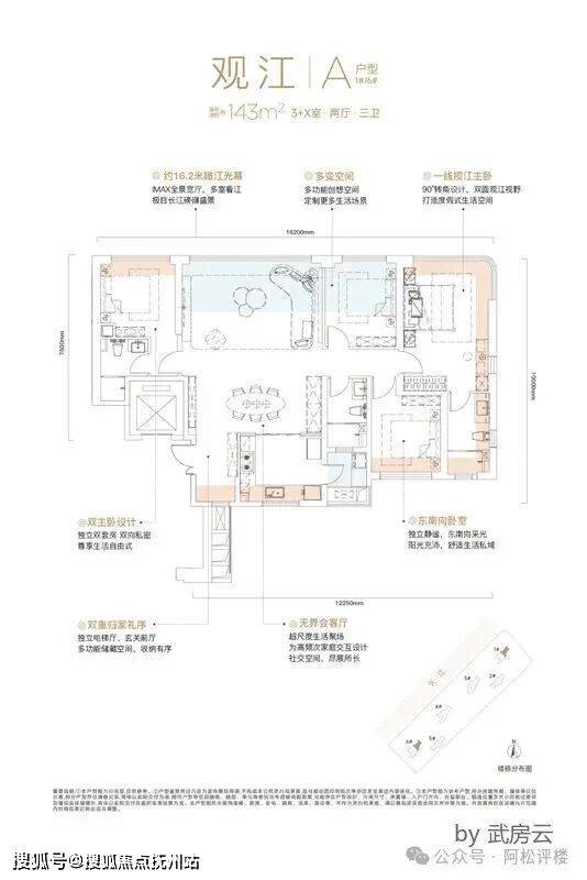 该户型三面采光,三开间朝南,带独立电梯前室,270度观江,设计非常有想象力。