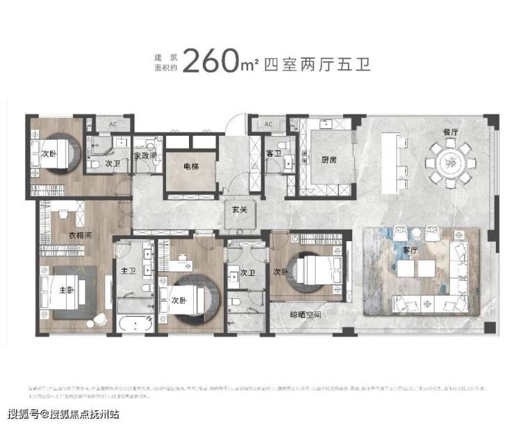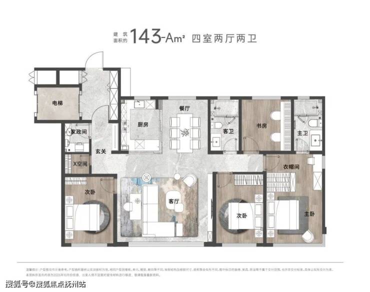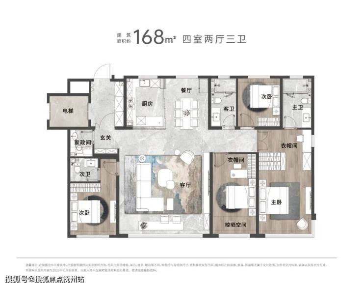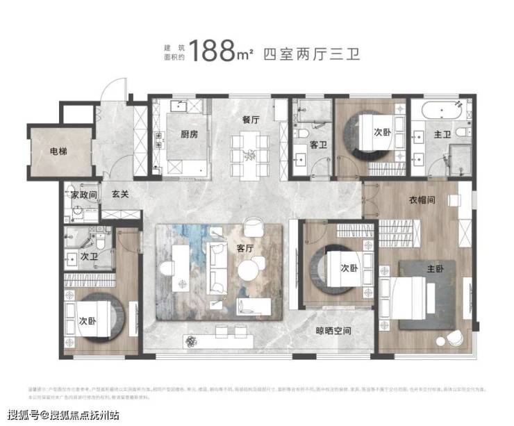 11号楼建面约168㎡户型:创新性地采用“双主卧”格局——不再区分主次,让夫妻与两个孩子(或一方父母)都能享受套房级的尊崇礼遇,从根本上解决早起洗漱、作息不同的生活冲突。
