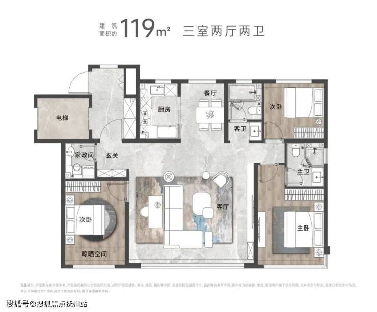 10号楼建面约119㎡户型:入门级海景三居,为追求金沙滩海居生活的精英家庭,提供了极具性价比的“上车”机会。