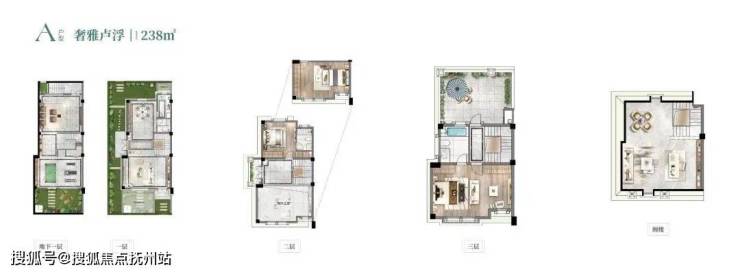 如建面约513㎡别墅户型,负一层可容纳泳池、影音室、台球室等多个休闲区;一层入户庭院贯通住宅北侧、南侧及西侧,室外延伸空间较大;二层、三层为主要居住区,二层可根据需求将客厅挑空改造成新的功能区;此外,还有一层阁楼。