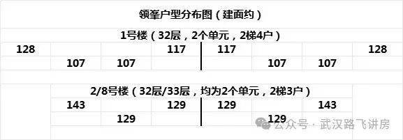 1号楼每个单元2梯4户,分布户型为建面约107-128平;1、2号楼均为32层、2个单元、带装修,8号楼33层、2个单元、毛坯。