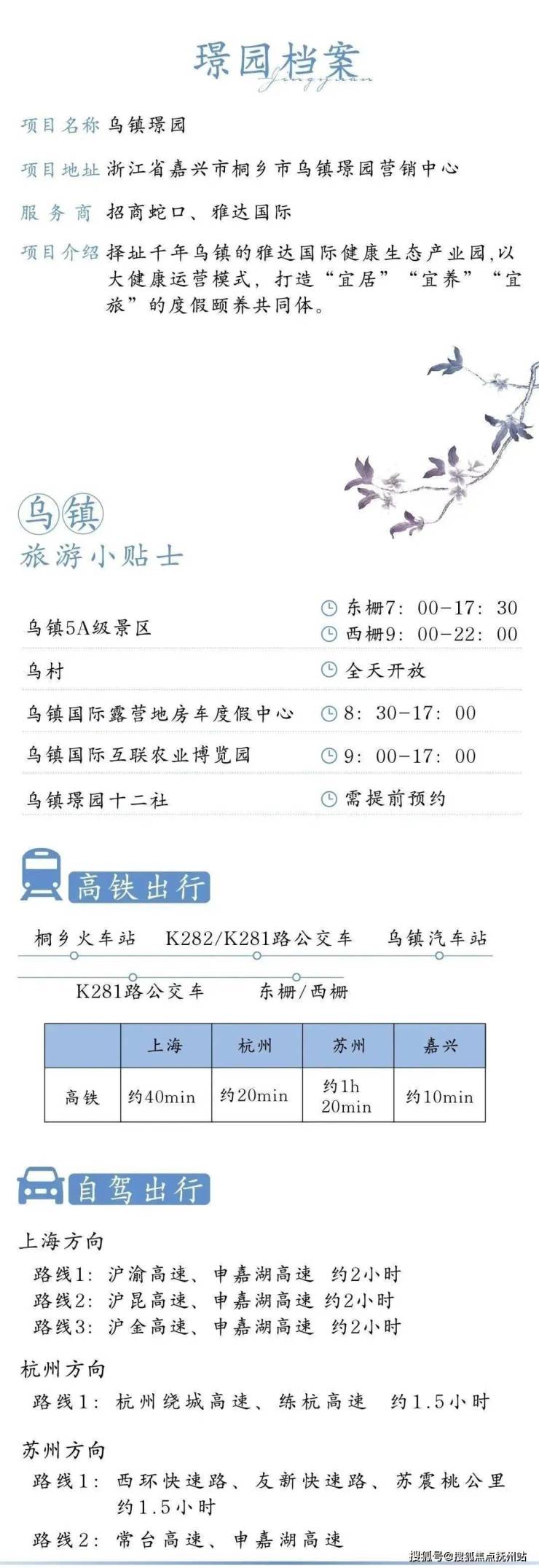 距上海约110公里、杭州约60公里、苏州约65公里、宁波约130公里,距嘉兴、桐乡、湖州均在50公里范围内;双高铁辐射,距离桐乡站约22公里、距离嘉兴南站约28公里。四通八达、无往不利,最大程度地保留乌镇的静谧与灵性,又可与繁华接壤。