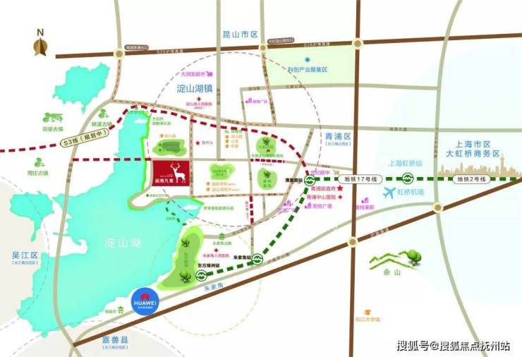 两地政府在推介会中提出一体化发展首先要实现交通的互联互通,重点提出规划轨交S3号线连接上海17号线漕盈路站,s3号线是苏州政府响应国家发展旅游业而打造的一条旅游专线,从苏州出发,环绕5大古镇(同里 周庄 锦溪 淀山湖 朱家角),并且打通新乐路与崧泽大道的断头路,从地铁和公路两方面将青浦和淀山湖融为一体,目前新乐路的断头路已经打通,后期往西延伸的松泽高架于2019年底完工,这条高架建成从我们项目到虹桥只有28公里30分钟车程。曙光路与上海的复兴路也将缩短淀山湖与上海青浦的距离(工期500天,预计2020年底通车)。上海轨道交通17号线(2号线延伸段)已于2017年年底正式通车,使我们板块快速融入大上海都市圈。项目距离最近的17号线漕盈路站,距离约7公里,17号线可以换乘上海地铁2号线,可以快速到达上海市区,轨交17号线无疑成为淀山湖新城承接东侧大虹桥区域的辐射、打通整合湖滨资源的潜能,扮演着重要角色。