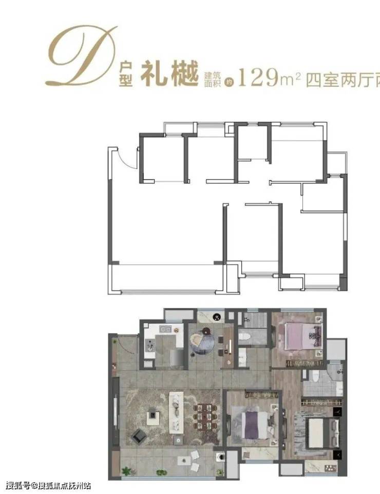 约129㎡户型,全明方正四室,IMAX大横厅,奢阔双厅衔接景观阳台,采光充沛;U型厨房设计,高效便捷;主卧套房设计,自带飘窗、独卫;多功能房设计,满足家庭成长需求,百变随心。