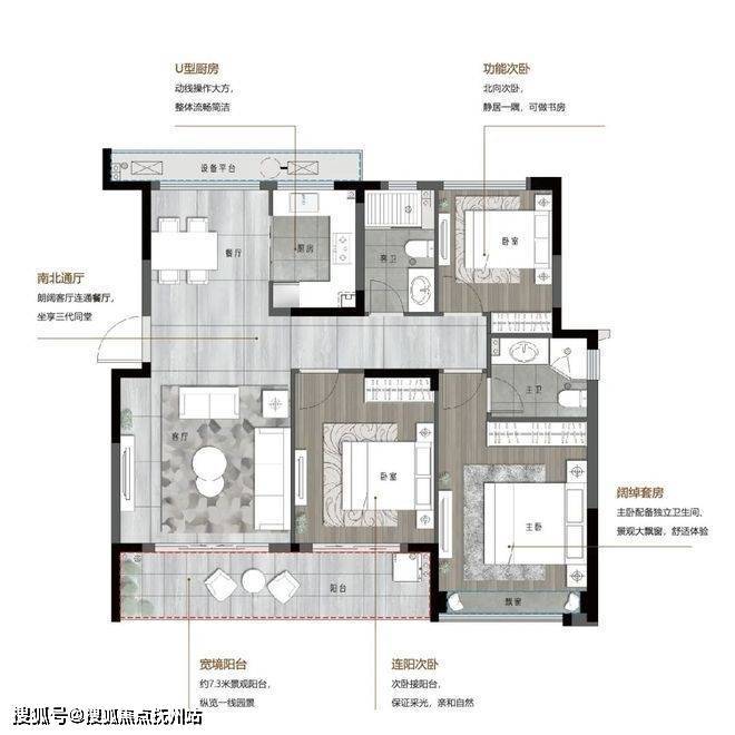 约10.5米的三开间阳台,更是这个户型的神来之笔,被业主们称为“家庭的第五空间”,这里既可满足全家人的日常晾晒,又可实现着情感价值的延伸,晨起的阳光瑜伽、午后的景观下午茶、夏夜里的观星台等,在日常之上做的每一个加法,都是生活的美好奥义。