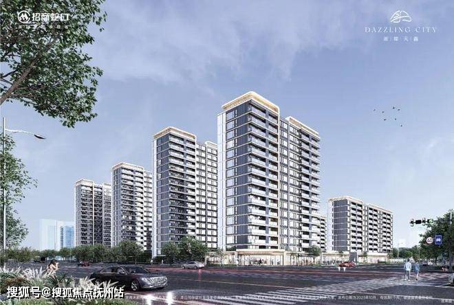 璀璨天鑫外立面延续招商经典IP视觉——非对称宽幕立面设计,香槟金金属板+浅灰色质感立面,特色的风帆塔冠造型,立体层次感更强,精致而不繁琐。