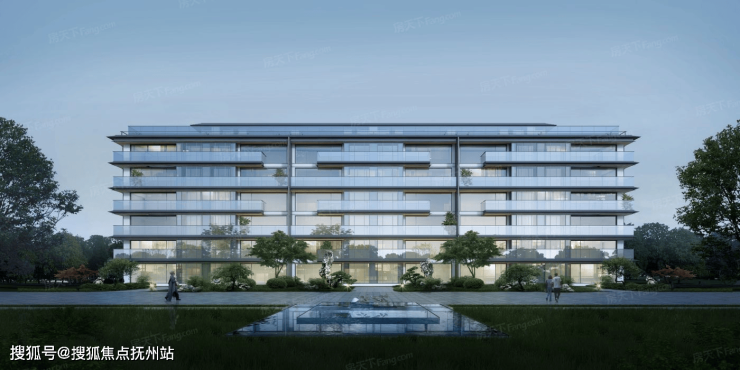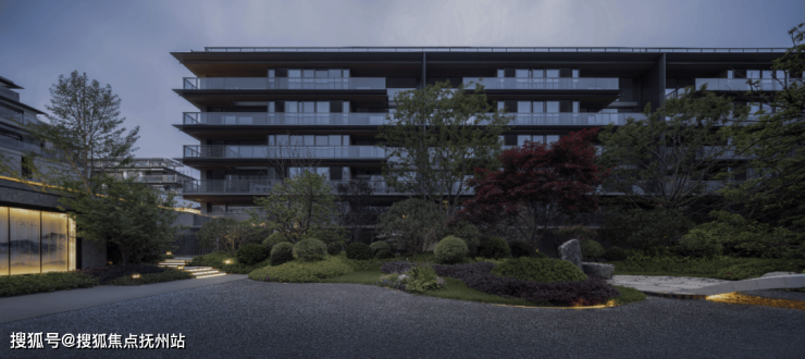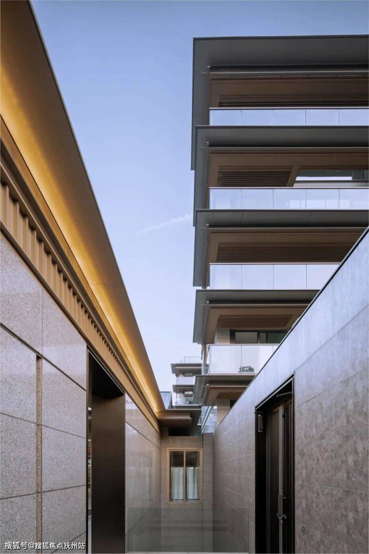 建筑立面上,采用现代东方云庐系,突出建筑的水平感和线条感,结构轻盈,纤细精致。