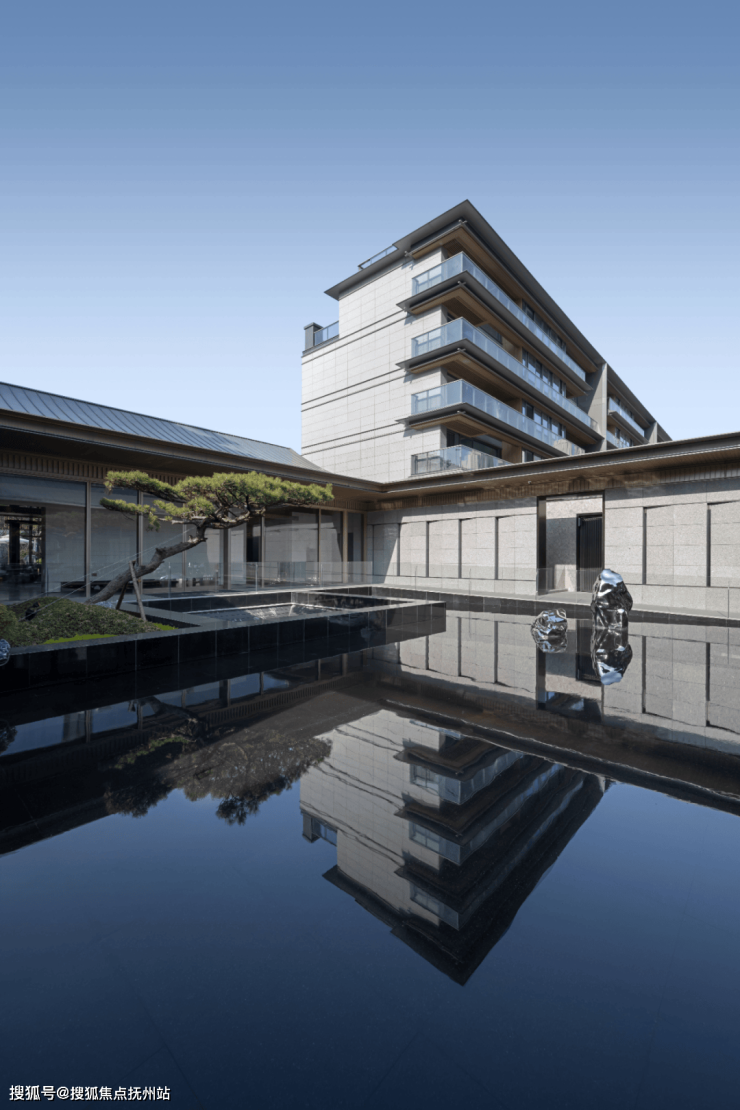 一进水院,所有的建筑落地,傍晚时分的黄昏和清晨耀眼的阳光都会倒影到水面上,百年典藏的松树私藏在这样一个院落里面。