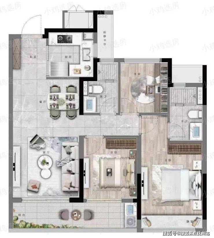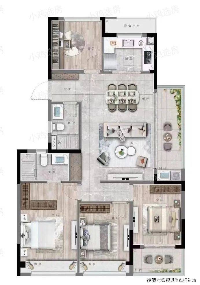 建筑面积约130方的户型,设计出了双飘窗、双阳台,产品力爆棚。南向家政阳台方便晾晒,东侧270°可观景阳台,满足休闲娱乐需求,功能划分明晰;建筑面积约18.6㎡的主卧是套房设计,空间阔绰,生活舒适感更强。