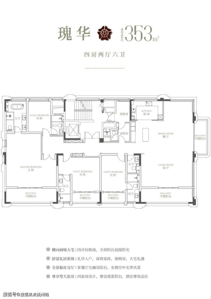建筑面积约353㎡瑰华洋房户型,南北纵向边厅,收藏级稀缺大平层。三阳台设计,实现270度园景、水域、城景视野三重奢享。