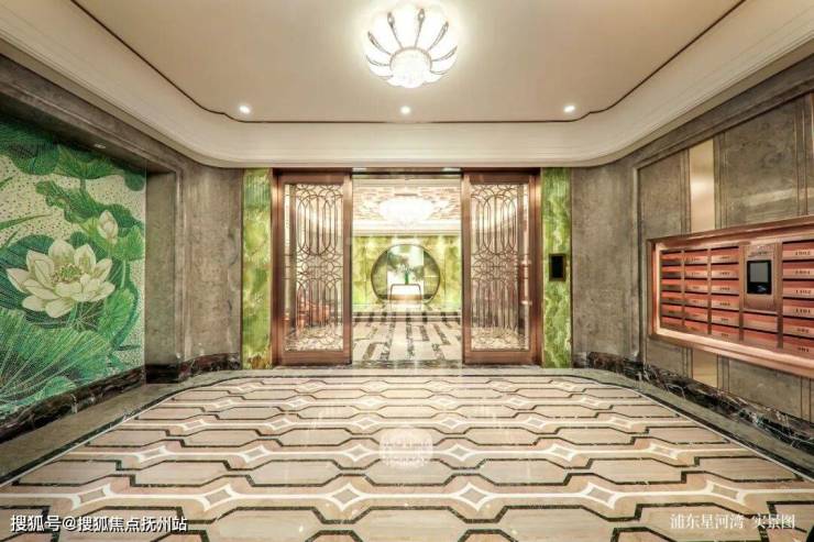 星河湾独有的反复推敲择定的双开大门,以108道工序,手工打造9个月。在吊顶工艺上选用燕尾榫卯拼接,L 角整板裁切。水刀工艺,为每一块大理石无缝匠心拼接。